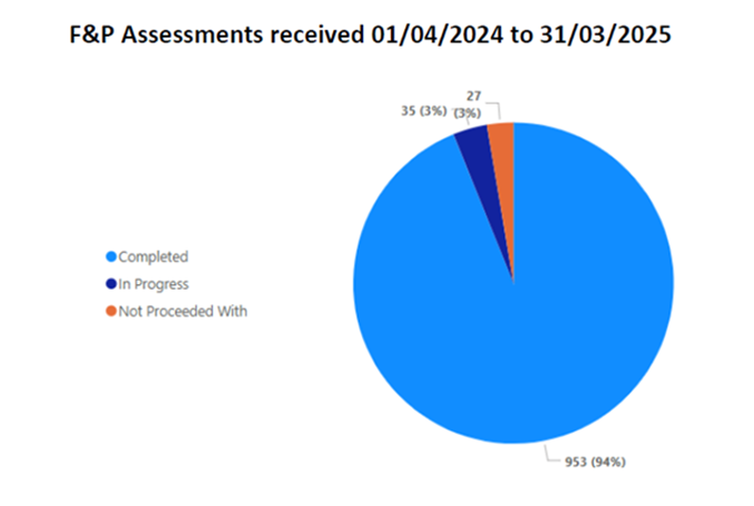 Note that in the pie chart titled ‘F&P Assessments received 01/04/2024 to 31/03/2025’, applications shown as “not proceeded with” include F&P applications that are withdrawn before/after a determination is made as to the individual’s fitness and propriety.