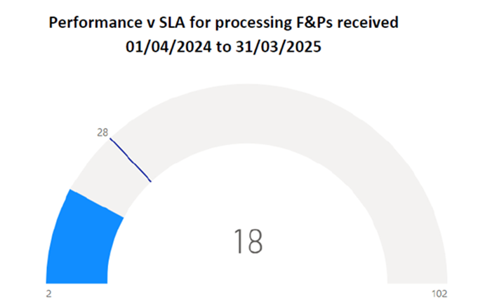 The semi-circle pie chart titled ‘Performance v SLA for processing F&Ps received 01/04/2024 to 31/03/2025’ reflects an average of 18 days to process a notified and accepted Controlled Function against the Service Level Agreement (SLA) of 28 days. Notified and accepted Controlled Function assessments continue to be processed well within the SLA.