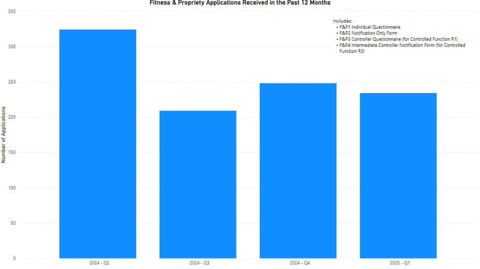 The bar chart titled ‘Fitness and Propriety Applications received in the past 12 months’ highlights the number of F&P applications assessed over the 12 months to the end of Q1 2025.
