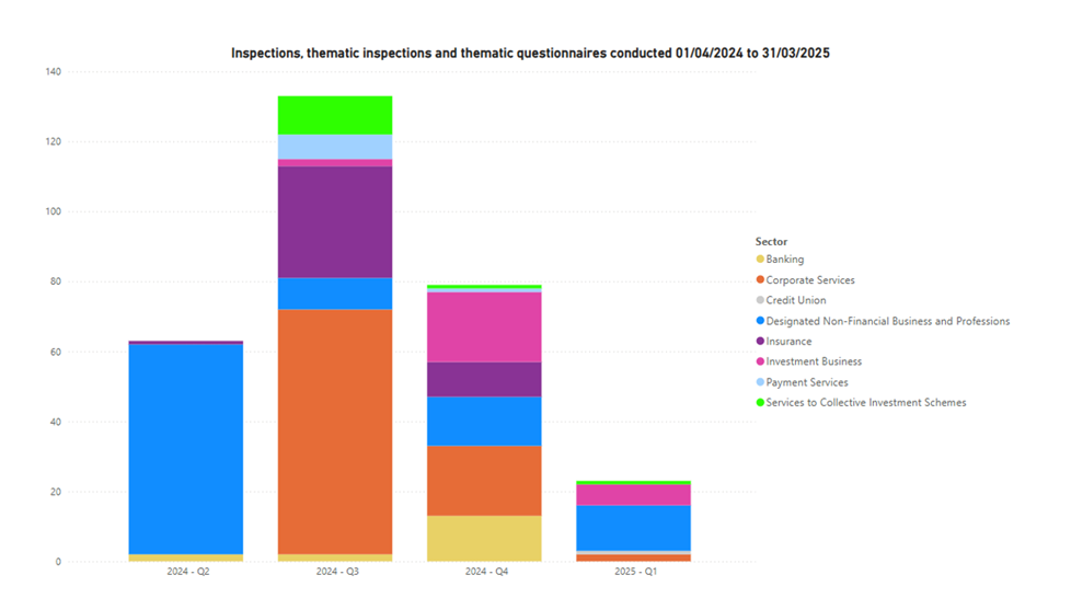 The bar chart titled ‘Inspections, thematic inspections and thematic questionnaires conducted 01/04/2024 to 31/03/2025’ highlights the number of inspections, thematic inspections and thematic questionnaires carried out by the Authority over the course of 12 months to the end of Q1 2025 (excluding Beneficial Ownership entity inspections which are detailed separately further below).