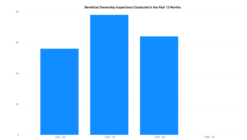 The bar chart titled ‘Beneficial Ownership inspections conducted in the past 12 months’ reflects the entities inspected over the 12 months to the end of Q1 2025.