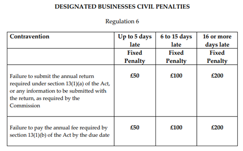 Please note the deadline to pay the fee (if overseen by the Authority for designated businesses AML/CFT Oversight) and submit the annual return is 1 November 2020. Any annual return submitted or fees paid after 1 November 2020 will be issued a civil penalty in line with the below table and the Designated Business (Civil Penalties) Order 2015.